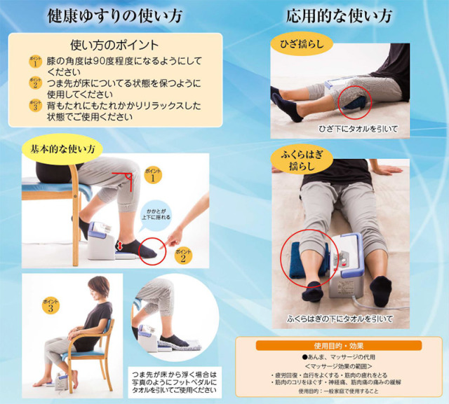 健康は足元から。健康ゆすりは、貧乏ゆすり運動を補助し下肢のセルフケアを目的として開発された管理医療器です。貧乏ゆすりは、医療現場ではジグリングと呼ばれ、今注目の足元からの健康法です。健康ゆすりはそのような貧乏ゆすり運動を補助し足元から健康管理を行うセルフメディケーション機器です。コンパクト設計なので、ご家庭でも職場でもどこでもご利用できます。